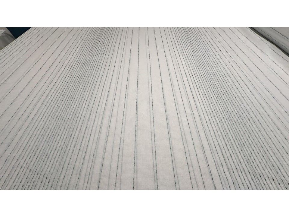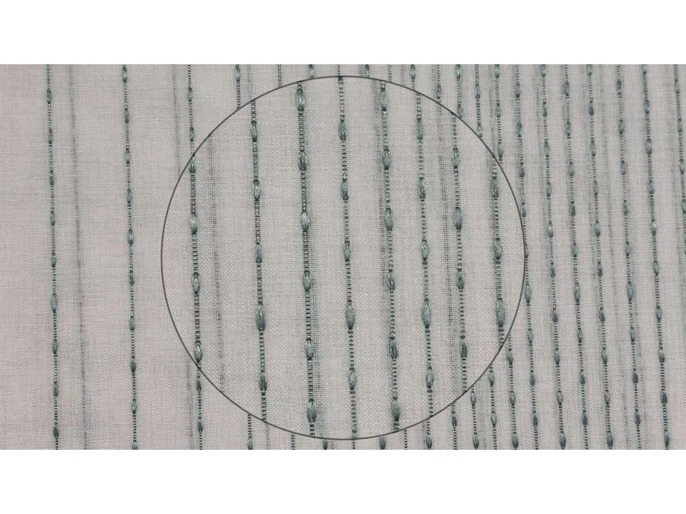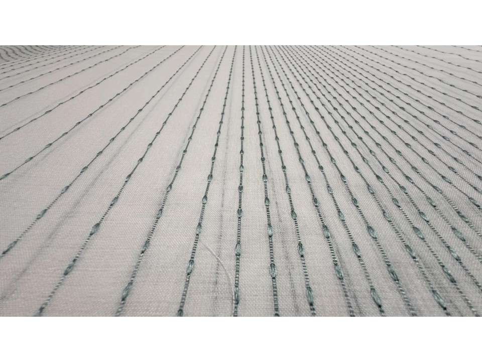 Тънък плат за пердета с вертикални черти в тюркоазен цвят и с оловна нишка . Имитация на лен. Подходящ за декориране с плътни завеси или самостоятелно. Ширина на плата 310 см.